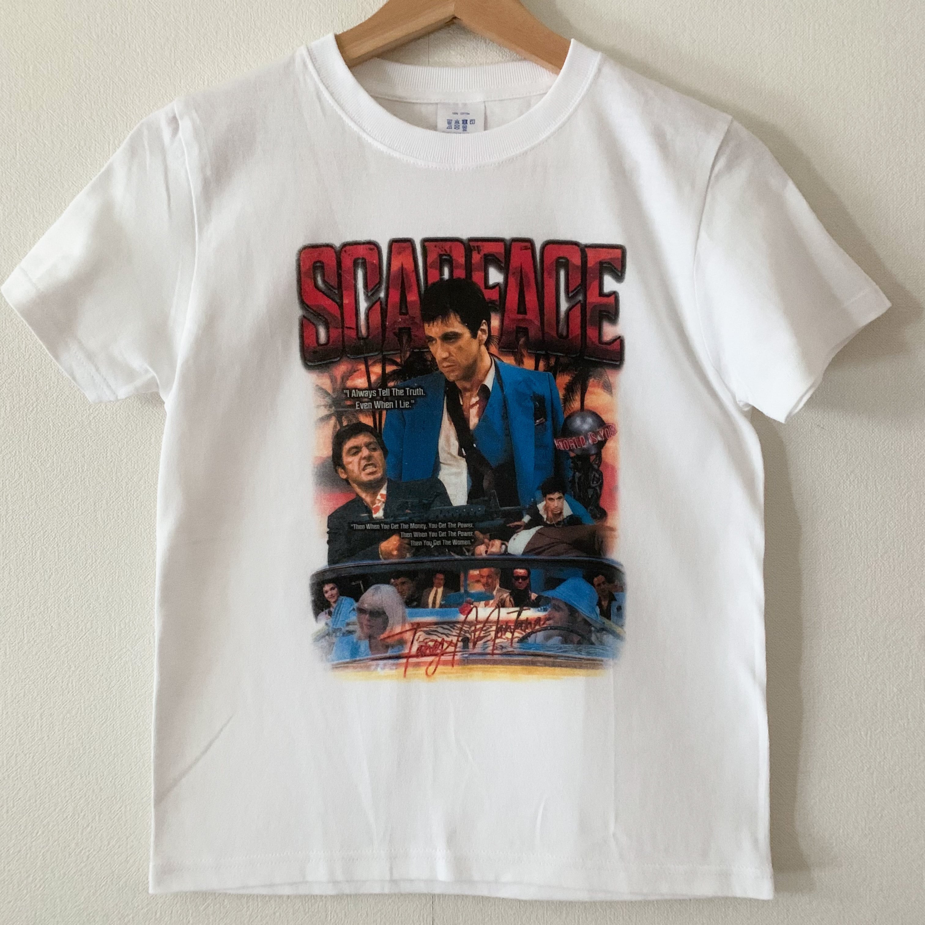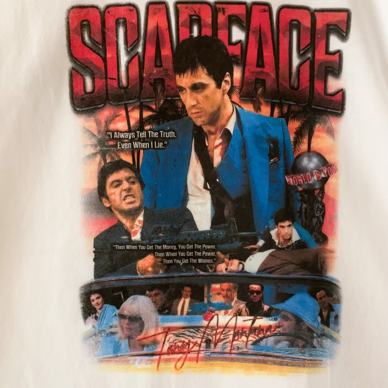 名俳優、アル・パチーノ演じる主人公トニー・モンタナがコカインの密売でのし上がり自滅していく様子を描いたマフィア映画の傑作で、のちに黒人の若者達からの熱狂的な支持により都市部のギャングスタ・ライフのバイブル的存在となった1983年公開作品「SCARFACE」(スカーフェイス)のVINTAGE HOMAGE TEE。